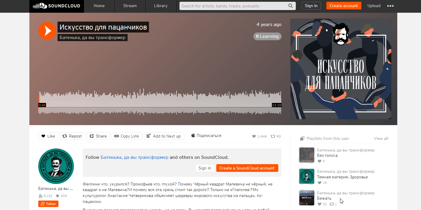 - «Искусство для пацанчиков» — нужный абсолютно всем нам подкаст об искусстве простым языком, по-пацански. Для саморазвития, интереса и чтобы было чем блеснуть в умном разговоре;)