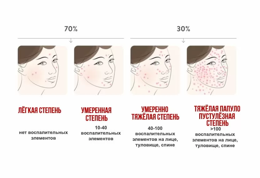Для легкой формы угревой болезни характерно наличие на коже комедонов (до 20 шт.), небольшого количества воспалительных элементов. Общее количество угрей обычно не превышает 30 шт. Средняя степень акне характеризуется наличием на коже большого количества черных точек и подкожных угрей (около 20-100), не меньше 15 папул и пустул. Общее количество высыпаний при акне средней степени тяжести обычно не превышает 120. Тяжелые формы заболевания характеризуются наличием комедонов, папул, пустул, а также кист (общее количество высыпаний – около 120-125, преобладают воспалительные элементы).