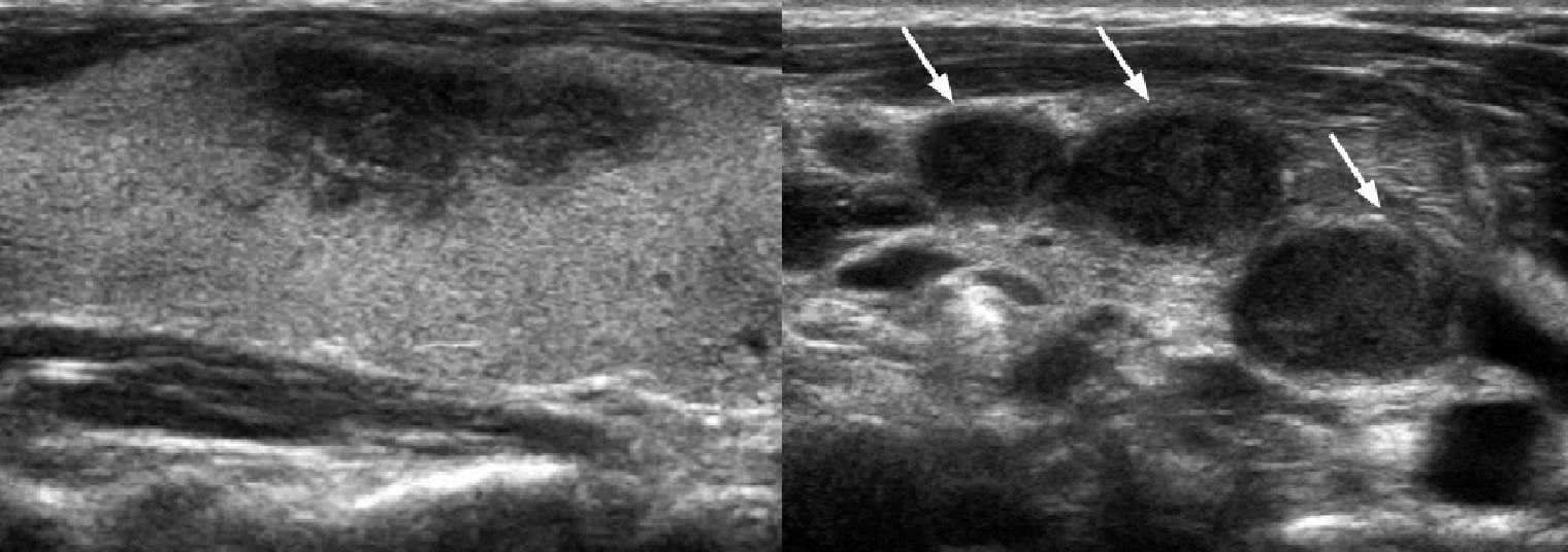 На УЗИ отмечается изменение размеров щитовидной железы в сторону увеличения илиуменьшения, а также просматривается изменение структуры органа. Результаты обследованиядополняют или конкретизируют лабораторные заключения.