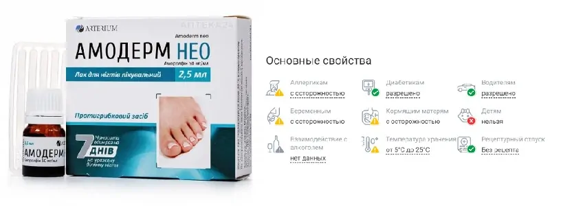Амодерм Нео — лак можно использовать 1 раз в 7-10 дней, эффективен только в том случае, если ногтевая основа не повреждена. Отлично подходит в качестве профилактического средства от грибковых инфекций.