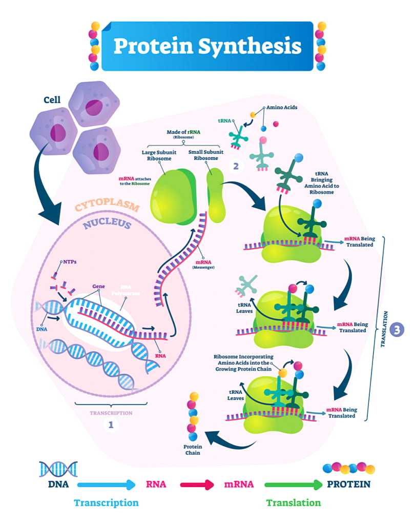 Вместо этого кусочки информации из ДНК копируются в более мелкие одноцепочечные молекулы, известные как информационная рибонуклеиновая кислота (РНК). МРНК выходит из штаб-квартиры и попадает на фабрику белка, которой является рибосома. В рибосоме инструкции по присоединению аминокислот, кодируемые на РНК, интерпретируются как образование белка. Аминокислоты прикрепляются одна за другой, как бусинки в ожерелье, до тех пор, пока процесс не будет завершен, как определено кодами инструкций.