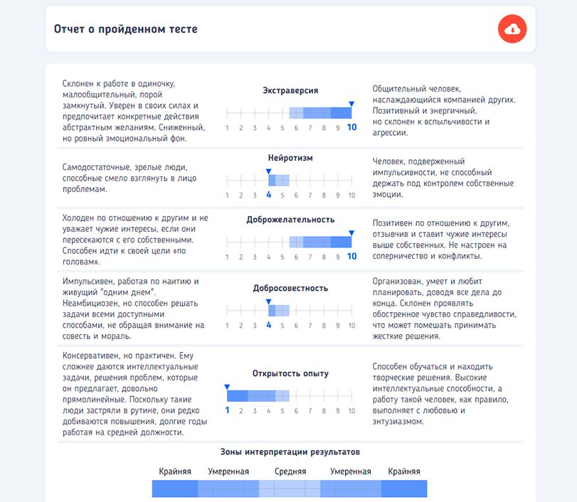 Стремиться же нужно к тому, чтобы главные для должности или работодателя черты характера немного выделялись из общей оценки. При этом ни одно качество не должно находиться в диапазоне 1-2 и 9-10, так как у каждой черты характера есть как положительные аспекты, так и отрицательные.