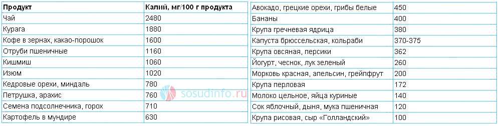В меню важно включать мангольд, бобы, куриные яйца, шпинат и грибы. Такой рацион снабдит организм минералом в количестве 150 % от суточной нормы. Среди других продуктов, богатых калием: картофель, помидоры, авокадо, шпинат, фасоль, горох, сухофрукты (изюм, курага, чернослив), апельсиновый сок, фрукты и ягоды (бананы, апельсины, клубника).