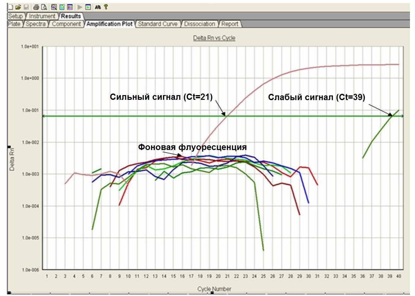 Ct = Пороговый цикл. Обычно ПЦР в реальном времени проходит в течение 40 циклов. Пороговый цикл наступает тогда, когда кривая амплификации пересекает линию порога чувствительности прибора (в месте, где график кривой амплификации становится линейным). Это значение необходимо для анализа. Чем выше значение порогового цикла (Ct=30-35), тем меньше мРНК находится в образце, так как нужно больше времени для амплификации необходимого для интенсивной флуоресценции количества копий мРНК. Если значение Ct невелико (10-15), это свидетельствует о том, что ген экспрессируется очень активно. Обычно внутренний контрольный образец имеет меньшее значение Ct, чем исследуемые гены.