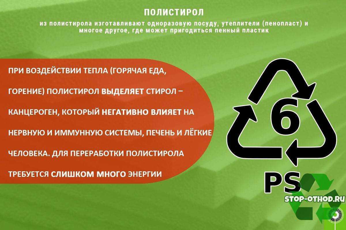 Если на контейнере изображён треугольник из трёх стрелочек внутри которого вписана цифра 6, а снизу расположены буквы PS, это значит, что материал изготовления ёмкости — полистирол. Ёмкость из данного материала запрещено разогревать в микроволновке и использовать для вкладывания горячих продуктов. Даже при минимальном подогреве полистирол выделяет очень опасные для здоровья вещества.