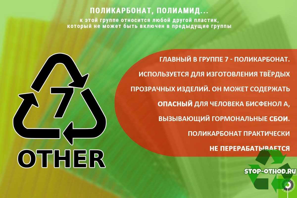В данную маркировку попадают все остальные виды пластика. Их применение не столь масштабно как у вышеперечисленных материалов. Сюда входят как безопасные пластики, так и вредные. Чаще к 7 группе относится поликарбонат.