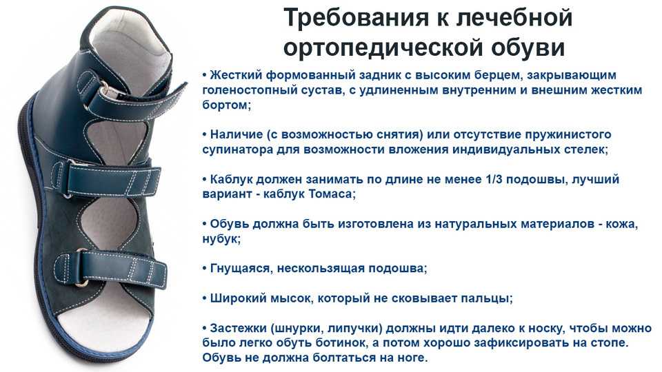 Начало коррекции — это подбор устойчивой обуви, которая плотно охватывает стопу. Ее изготавливают из натурального «дышащего» материала. Обувь должна иметь небольшой каблук и тонкую подошву, чтобы стопа чувствовала различный рельеф⁴. Если носить специальную ортопедическую обувь 5–6 часов в день, то спустя 2-4 года в 60% случаев можно достичь стойкого эффекта⁶.