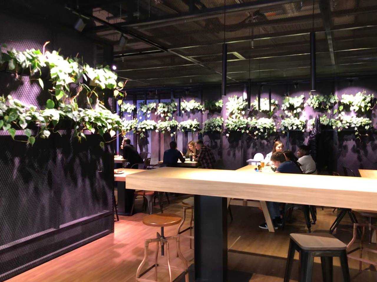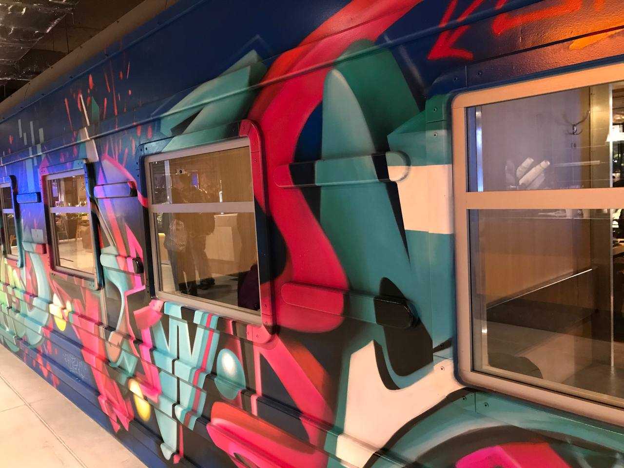 Немного подробнее остановимся на дизайне интерьера нового фудмолла. Что ж, тут стоит отметить, что создатели постарались на славу и действительно заморочились над созданием оригинальной атмосферы. Всё пространство выполнено в едином стиле, а атмосфера очень стильная и современная: много инсталляций, живые растения, а также граффити. Всё это создаёт уютную обстановку и располагает к приятному времяпрепровождению.