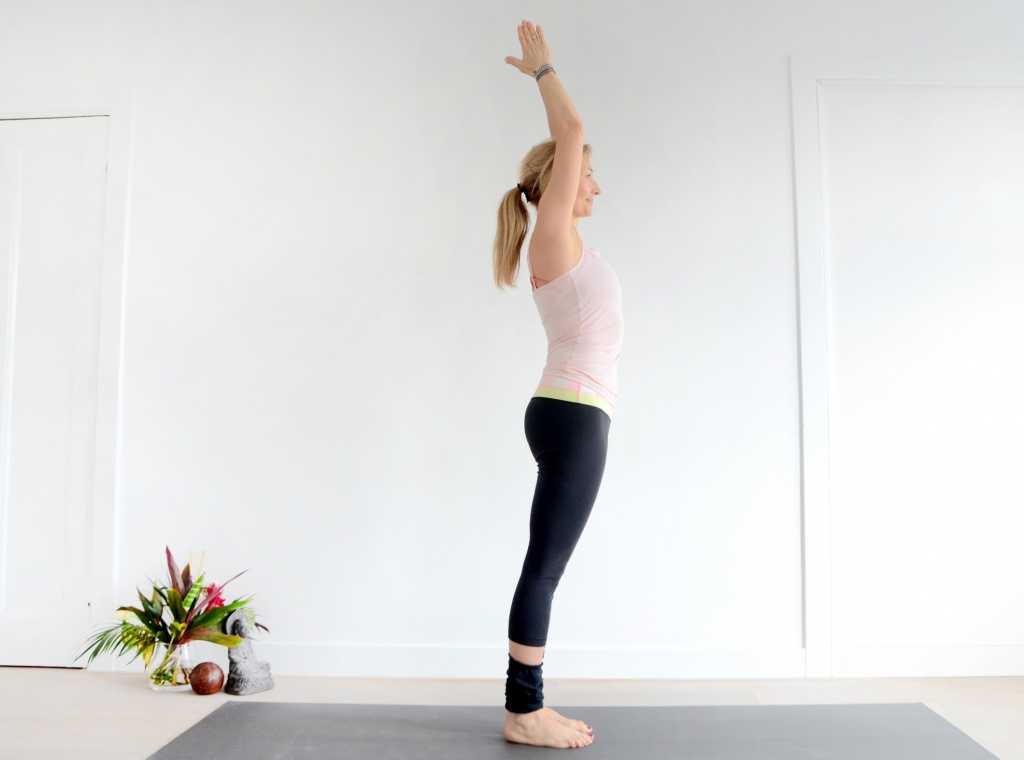 Упражнение 5. Встаньте ровно и закрепите пальцы в “замок”. Поднимите скрепленные таким образом руки вверх, тянитесь, вытягивая позвоночник. Во время подъема рук наполняйте легкие воздухом. Затем сделайте паузу в верхней точке, выдыхайте.