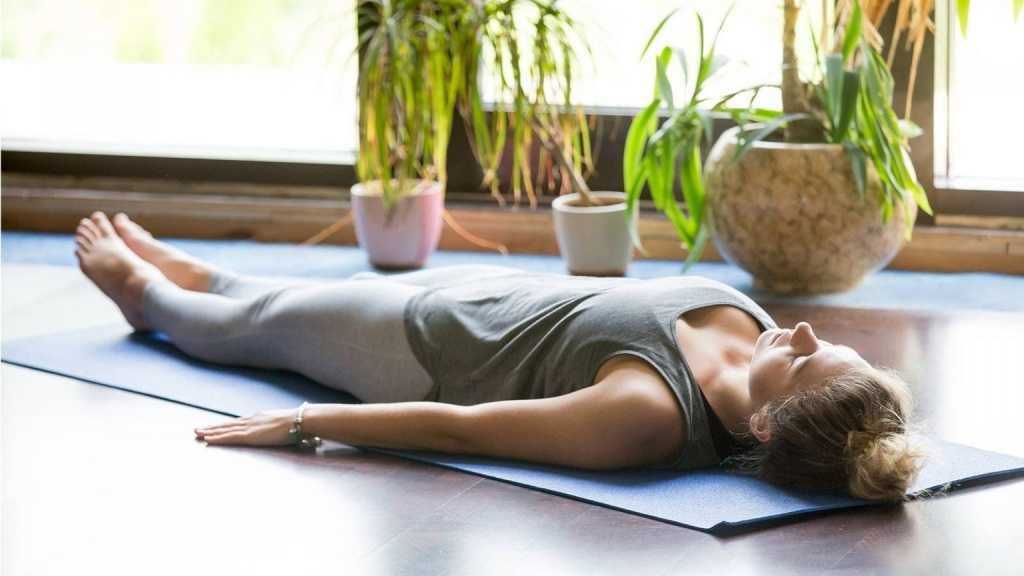 - Исходное положение — лежа на спине — ноги согнуты в коленях. Необходимо расслабиться и дышать с частотой до 40 вдохов-выдохов в минуту.