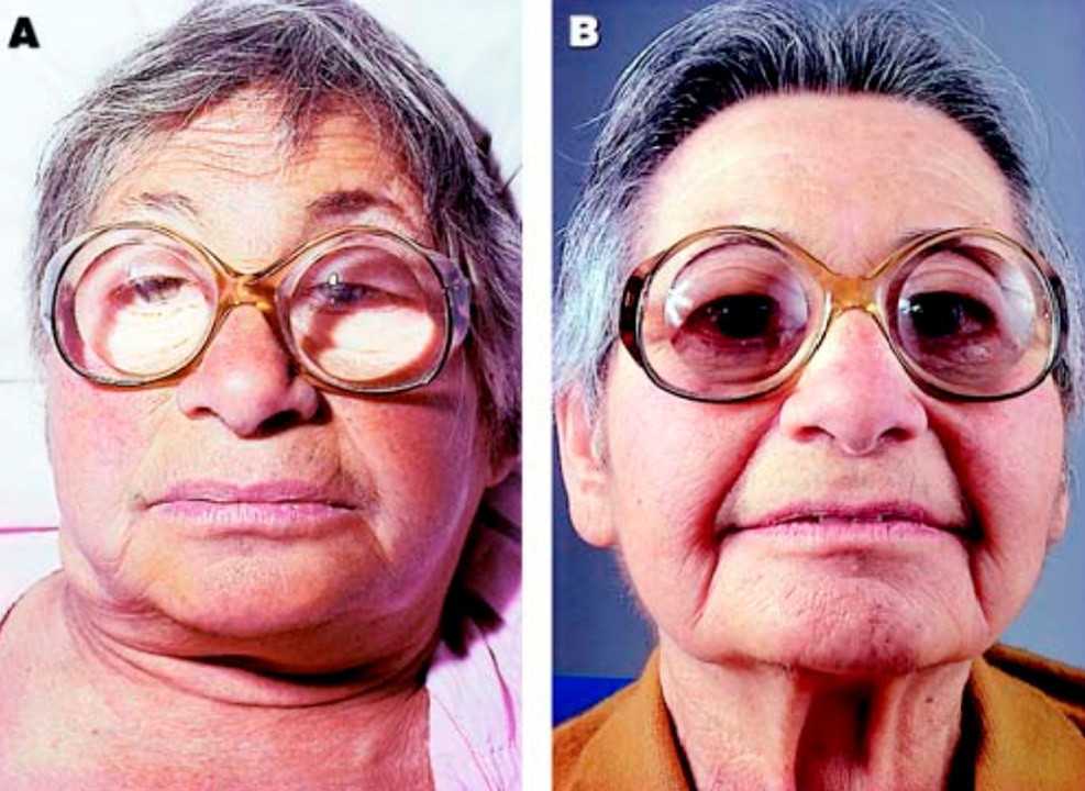 Обычно в глаза бросаются изменения в лице. Кожа становится сухой, появляются мешки под глазами, нижняя часть лица отекает, а брови и ресницы постепенно редеют (синдром королевы Анны). Мимика при этом бедная, невыразительная (рис. 2).