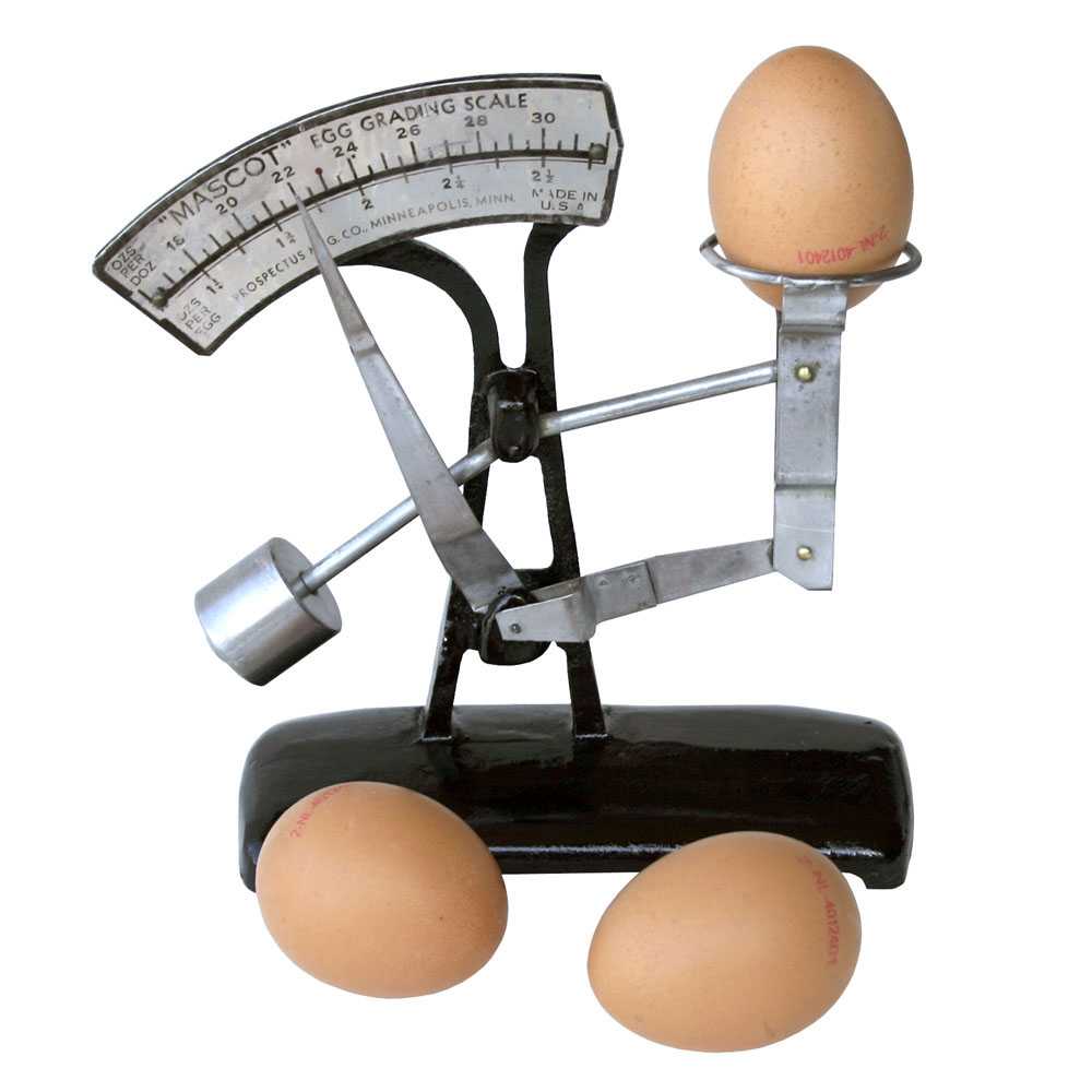Существуют специальные весы для взвешивания только яиц, но в промышленном масштабе они не используются. В коллекции Музея мер и весов более двух десятков таких экспонатов, и все они отличаются разнообразием.