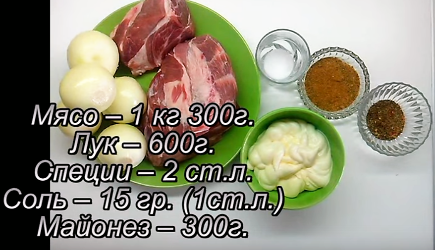 На два килограмма мяса используют килограмм лука, стакан воды, 2 ст.л. уксуса, ст. л. соли и чайную ложку сахара.